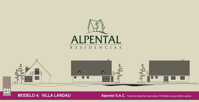 Villa Landau has been developed as a one level chalet with a mezzanine. Both private and public spaces are featured in the main floor. The central axis marked by the upper roof edge is the main structure in the unit. The entrance is on one side and to the right we find the private area that has 3 bedrooms, one full bathroom and a laundry room. To the left we find the public sector and services: complete kitchen, large dining/living room and a bathroom. There is also a service room/office.
