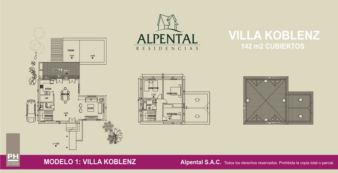 Villa Koblenz es un chalet estilo Suizo/Alemán con techos inclinados de fuerte pendiente y aberturas con vidrios repartidos, lo que le da un aspecto conservador más tradicional. El desarrollo en planta es tipo compacto. Con 2 bloques bien definidos. En un bloque cocina, comedor muy amplio y baño en el 1er piso y 3 dormitorios en el 2do piso. Este es el bloque alto con techo de 4 aguas y lucarnas.